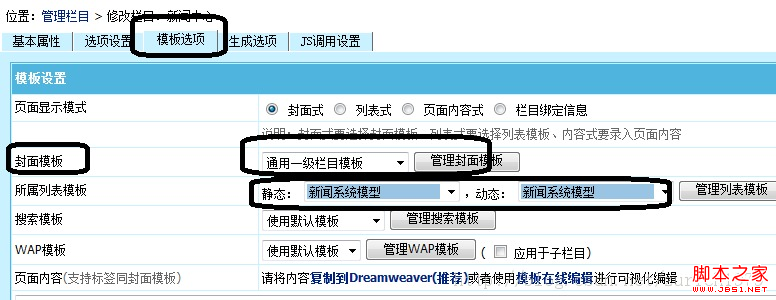 3. 進入修改頁面后 點擊 “模版選項” 頁, 即可看到當前網頁所采用的模版,以及列表模版,評論模版等。