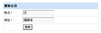 | <form name="searchmemberform" method="GET" action="/e/member/list/index.php"> <table width="380" border="0" align="center" cellpadding="3" cellspacing="1" bgcolor="#CDE2F8"> <tr> <td height="25" colspan="2"><strong>搜索會員</strong></td> </tr> <tr bgcolor="#FFFFFF"> <td width="20%" height="25">姓名:</td> <td width="80%"> <input name="show[]" type="hidden" value="truename"> <input name="hh[]" type="hidden" value="LK"> <input name="keyboard[]" type="text" value="王"> </td> </tr> <tr bgcolor="#FFFFFF"> <td height="25">地址:</td> <td> <input name="show[]" type="hidden" value="address"> <input name="hh[]" type="hidden" value="LK"> <input name="keyboard[]" type="text" value="福建省"> </td> </tr> <tr bgcolor="#FFFFFF"> <td height="25"> </td> <td> <input type="submit" name="Submit" value="搜索"> <input name="groupid" type="hidden" value="1,2"> <input name="sear" type="hidden" value="1"> <input name="andor" type="hidden" value="and"> </td> </tr> </table> </form> |