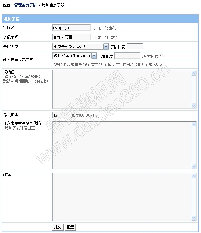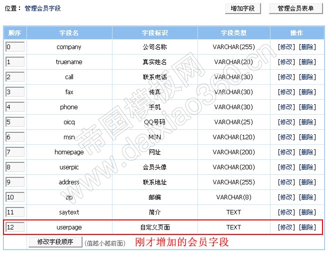 3、點擊提交后,返回管理字段頁面,可以看到我們剛增加的“userpage”字段,如下圖: