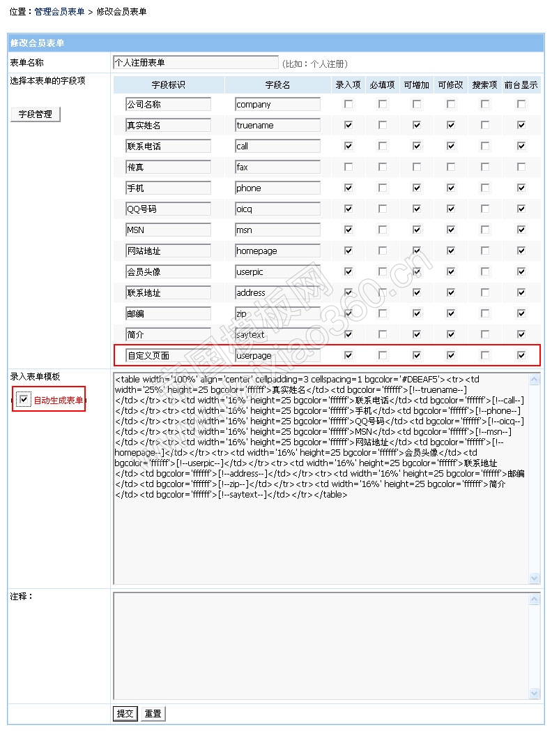 1、到“用戶面板”->“管理會員表單”->修改“個人注冊表單”,進入如下界面: