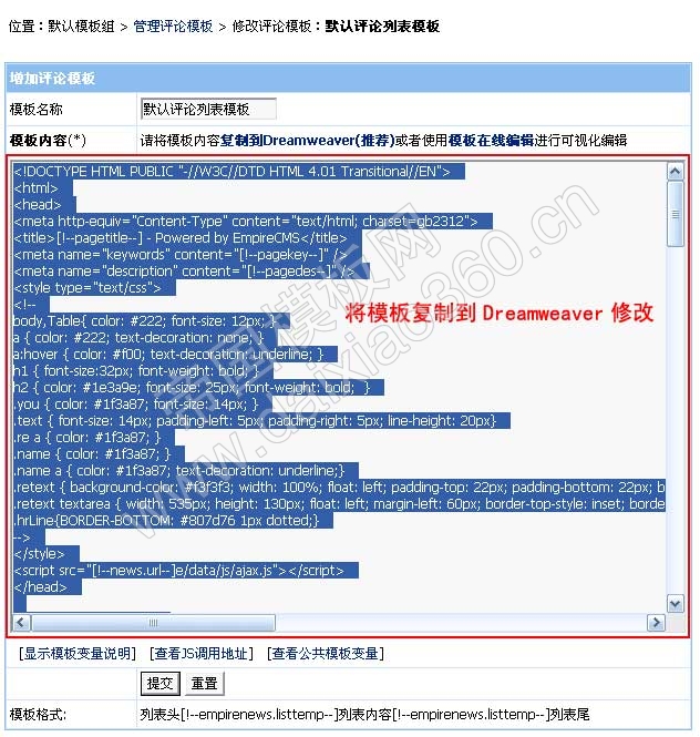 2、修改評論模板加上字段表單元素及字段顯示變量。
