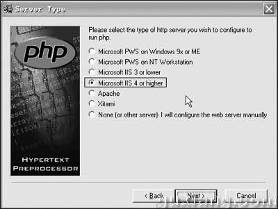 因為我們使用Windows XP系統自帶的IIS5.1,選擇“Microsoft iis4 or higher”單選項,點擊“下一步”后開始安裝,