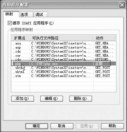 在“映射”標簽頁中,查看應用程序映射列表框中是否有擴展名為“.php”的選項(如圖4),如果存在則表示PHP安裝配置成功。
