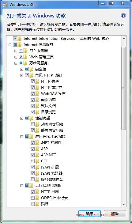 開機后,重新進入控制面板,進入“打開或關閉Windows功能”界面,按照下圖,將“Internet Information Services可承載的Web核心”和“Internet 信息服務”的相關功能選中。并單擊確定,正常安裝完畢后,不需要重起,但建議重起一次,這樣,在Windows7下,IIS7.5就成功安裝完了。
