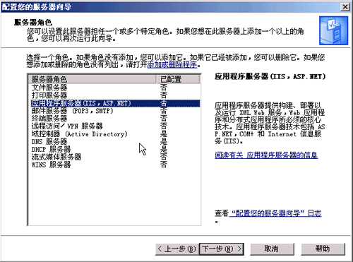 選擇“添加或刪除”角色,在“配置服務器”向導中可以看到一系列可配置的服務器角色,其中就有“應用程序服務器(IIS,ASP.NET)”選項,如圖二,選中該選項之后點擊“下一步”,向導提供了是否安裝ASP.NET和Microsoft FrontPage服務器擴展的選項。可以看到,微軟在這里采用了一種新型的“安裝任何部件之前總是