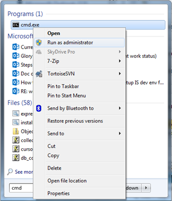 在開始->查找框中輸入cmd,右擊cmd.exe,選擇Run as administrator,進(jìn)入命令行界面。
