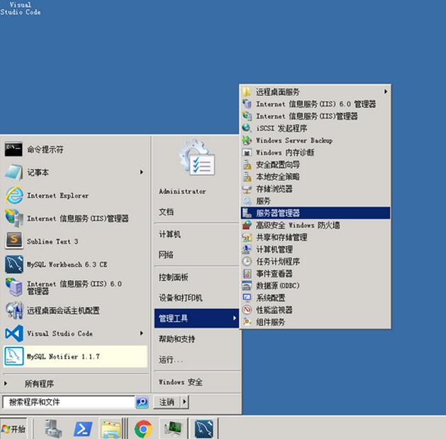 點(diǎn)擊開始=》管理工具=》服務(wù)器管理器,打開“服務(wù)器管理器“。