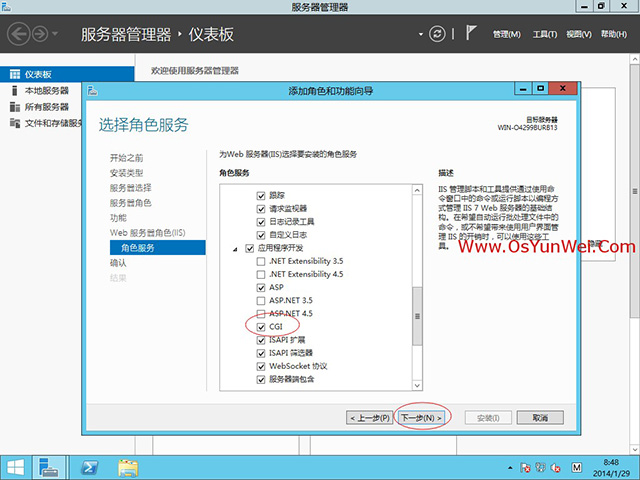 確保CGI被選中,其他的角色服務根據需要選擇,如果不知道如何選擇,建議選擇全部功能。