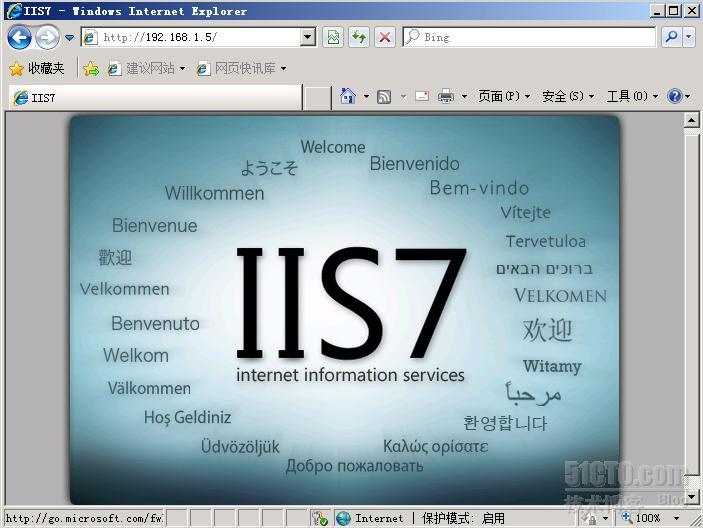安裝完成后,可以通過【管理工具】中的【Internet信息服務(IIS)管理器】來管理IIS網站,可以看到其中已經建好了一個名為“Default Web Site”的站點,在客戶端計算機client1上打開IE瀏覽器,在地址欄輸入web服務器的IP地址即可以訪問這個默認網站。