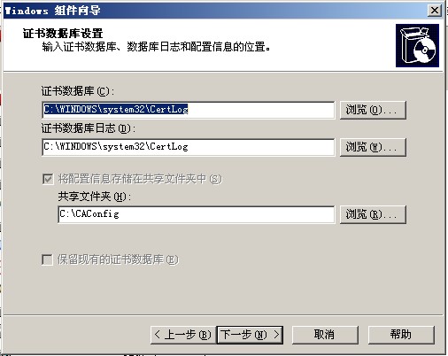 4.證書數據庫設置,用于保存證書的相關數據庫和日志文件,這個默認就行了。