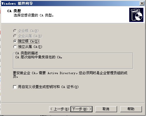 2.CA類型,這里有四種選擇,這里以“獨立根CA”為介紹。