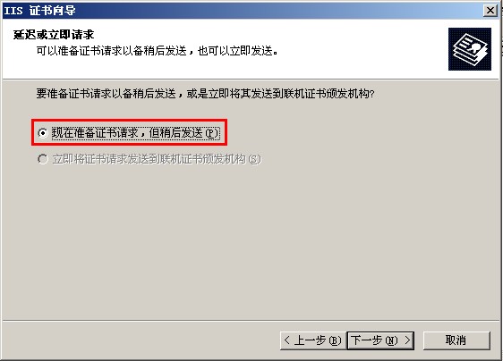3.選擇“現在準備證書請求,但稍后發送”,下一步
