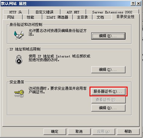 1.在IIS中的“默認網站”右鍵,選擇“屬性”,可看到網站屬性,點擊“目錄安全性”標簽頁,點擊“服務器證書”按鈕。