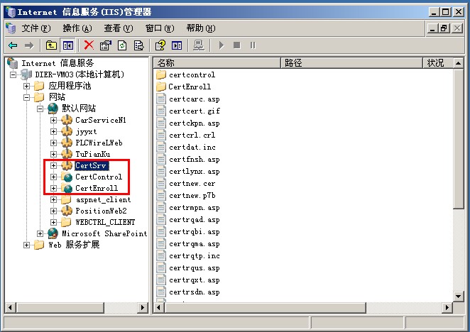 6.安裝完成后,在IIS中,還會增加三個相關的目錄,其中的“CertSrv”就是證書申請的頁面了。