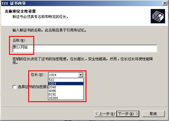 5.名稱和安全性,名稱默認是IIS網站的名稱,密鑰長度默認為1024位,下一步