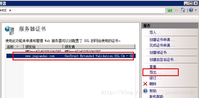 3.選擇需要導出的證書,在右邊窗口選擇“導出”:
