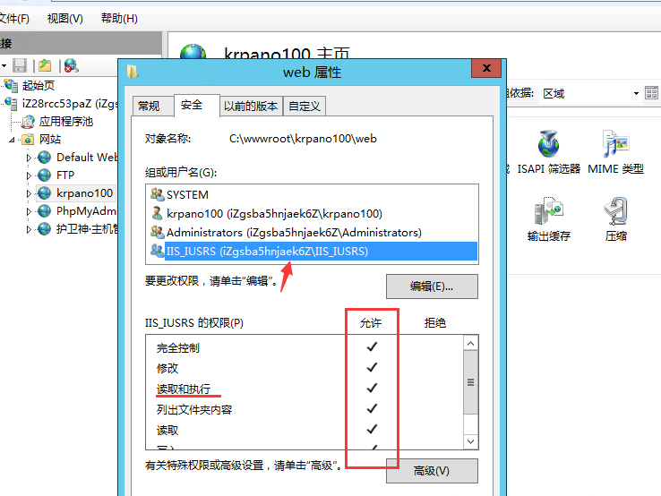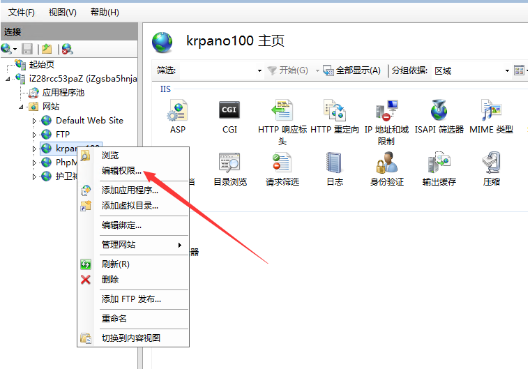 2:接下來,我們讓IIS_IUSRS(糾正:根目錄所屬ftp用戶,即krpano100)對站點根目錄有執行權限,打開iis,網站->相對應的站點->右鍵->編輯權限,為IIS_IUSRS添加執行權限。