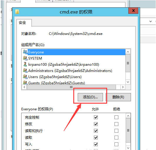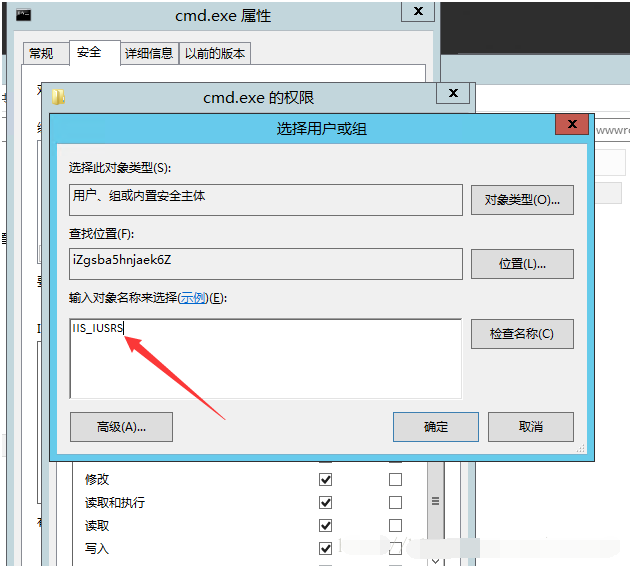 1:進入C:/Windows/System32,找到cmd.exe,然后右鍵->屬性->安全->編輯->添加,添加上IIS_IUSRS組,并賦予可執行權限,如圖: