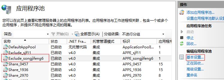 打開應用程序池,選擇要調整的程序池,再點擊右側操作欄上的“基本設置”。
