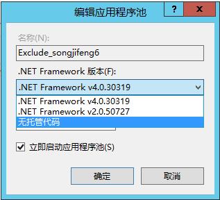 在“編輯應用程序池”對話框中,就可以選擇.NET Framework版本了。請看下面的圖示,雖然只顯示了2個版本,但可以支持2.0/3.5/4.0/4.5四種.NET框架,或者您還可以選擇“無托管代碼”,讓程序池完全不支持.NET。