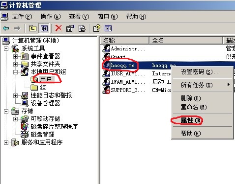 4.找到剛新建的用戶,點擊屬性,接下來,我們要降低用戶的權限
