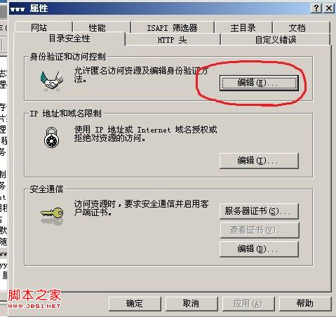 6.接下來,我們把剛建的帳號,應用到網站里, 打開IIS管理器,選擇我們已經建的網站,屬性-目錄安全性-編輯身份驗證和訪問控制".