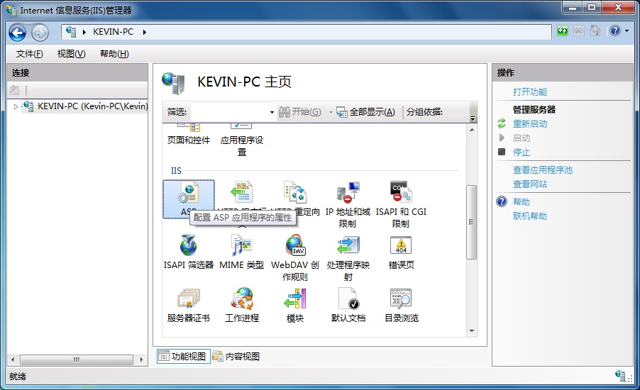 三、進入Internet信息服務(IIS)管理器【開始菜單中搜索IIS就出來了】-->雙擊ASP