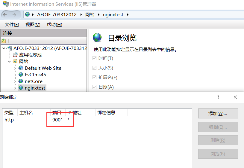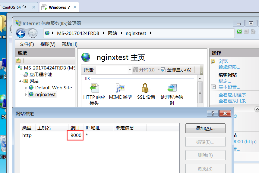 public class HomeController : Controller { // GET: Home public ActionResult Index() { List<string> info = new List<string>(); info.Add("服務(wù)器名稱:" + Server.MachineName); info.Add("客戶端IP地址:" + (Request.UserHostAddress=="::1" ? "127.0.0.1":Request.UserHostAddress)); info.Add("HTTP端口:" + Request.Url.Port); ViewBag.info = info; return View(); } }2. 因?yàn)槲业膎ginx是裝在虛擬機(jī)里的,現(xiàn)在虛擬機(jī)里在iis部署一個(gè)站點(diǎn),端口為:9000