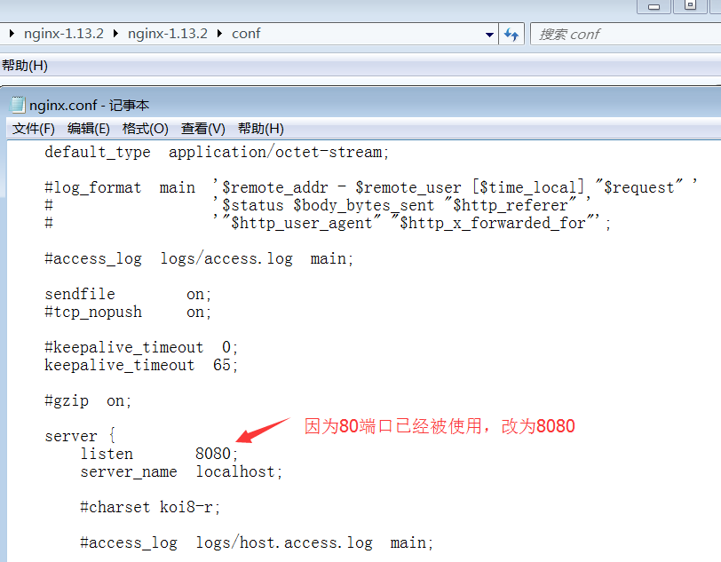 3.因?yàn)槲译娔X80端口已經(jīng)被使用,所以修改配置文件改為監(jiān)聽8080端口