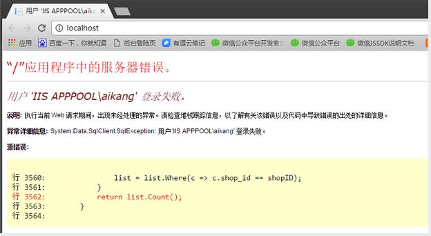 問題描述:用戶 'IIS APPPOOL/aikang' 登錄失敗。在VS里面打開能正常運行,在IIS里面打開就總是提示這個錯誤,看網上說是修改應用程序域 ,進程模型里面的標識,修改成LocalSystem后,又提示:【無法打開登錄所請求的數據庫 "ikang_WXshop"。登錄失敗。用戶 'NT AUTHORI...