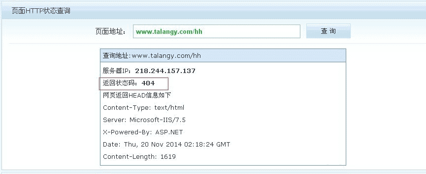 6、測試能夠打開404錯(cuò)誤頁面,并不代表設(shè)置的404錯(cuò)誤頁面就成功了,從SEO方面說,如果您的網(wǎng)站HTTP狀態(tài)碼是返回200或302,是對(duì)SEO很不友好的,我們需要網(wǎng)站的HTTP返回狀態(tài)碼是404。我們可以利用HTTP狀態(tài)查詢工具測試網(wǎng)站的HTTP返回狀態(tài)碼。如下圖,網(wǎng)站HTTP狀態(tài)碼成功返回404,404頁面設(shè)置成功。