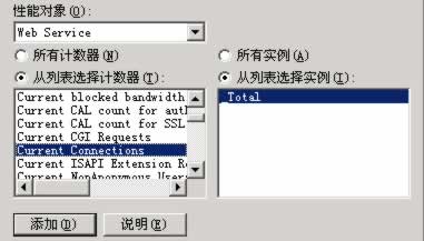 三、在“添加計數(shù)器”窗口,“性能對象”選擇Web Service,“從列表選擇計數(shù)器”選中Current Connection,“從列表選擇實例”選中你要統(tǒng)計的站點,最后點擊“添加”按鈕