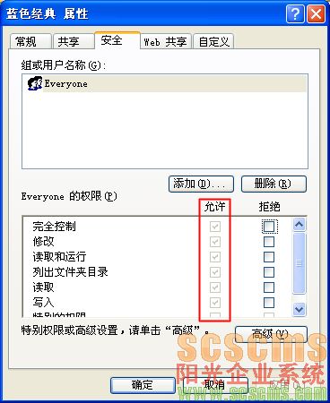 第二:在網站所在的文件夾上點右鍵,選擇“屬性”-->安全,給Everyone或者Users(根據系統不同選擇)完全控制的權限,也就是在允許下面全打上√,然后確定。