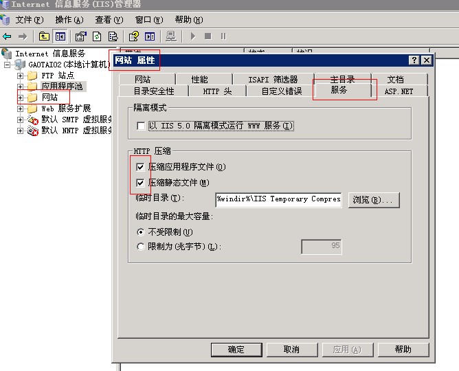 1. 打開Internet信息服務(IIS)管理器,右擊"網站"->"屬性",選擇"服務"。在"HTTP壓縮"框中選中"壓縮應用程序文件"和"壓縮靜態文件",按需要設置"臨時目錄"和"臨時目錄的最大限制";