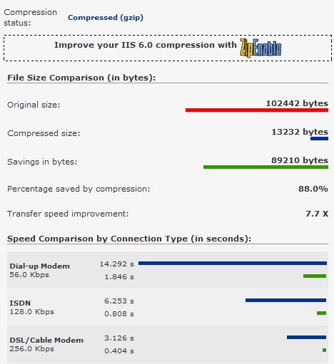 在部署的IIS 6.0上配置了GZIP壓縮,詳細的測試結果如下。