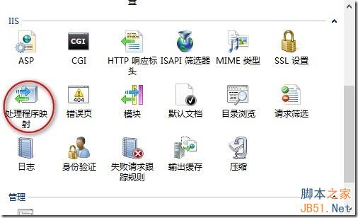 4、中間窗口選擇“處理程序映射”雙擊,然后最右邊選擇“添加模塊映射”