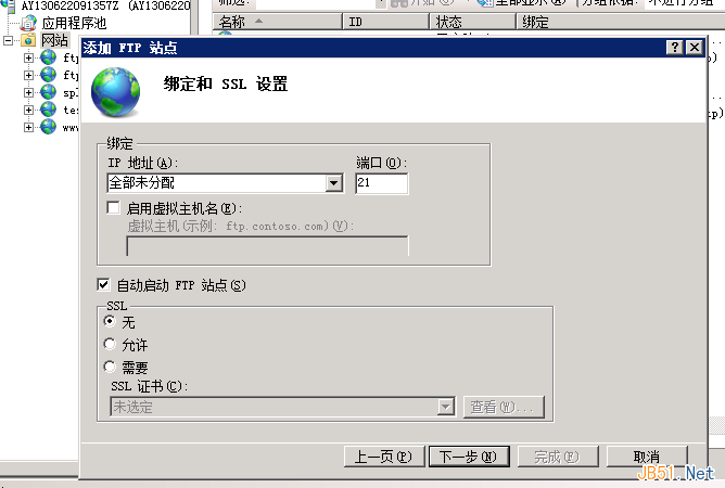 運行“inetmgr”打開IIS控制臺,右鍵點擊“網站”,選擇“添加FTP站點”。具體的配置項及其值如下: