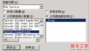 三、在“添加計數器”窗口,“性能對象”選擇Web Service,“從列表選擇計數器”選中Current Connection,“從列表選擇實例”選中你要統計的站點,最后點擊“添加”按鈕