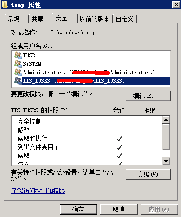 更改后的權限配置(必須包含 IUSER和IIS_IUSERS 權限或 Everyone )