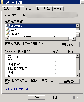 看到這我就想不明白了,既然目錄的權限有 "Everyone"項那么上傳的圖片的權限也應該繼承父類的權限才對,所以好長時間也沒有想明白這其中的原因,因此也不知道該如何下手解決,只是在網絡上漫無目的看有沒有類似的問題,并按照網站的說明進行嘗試。