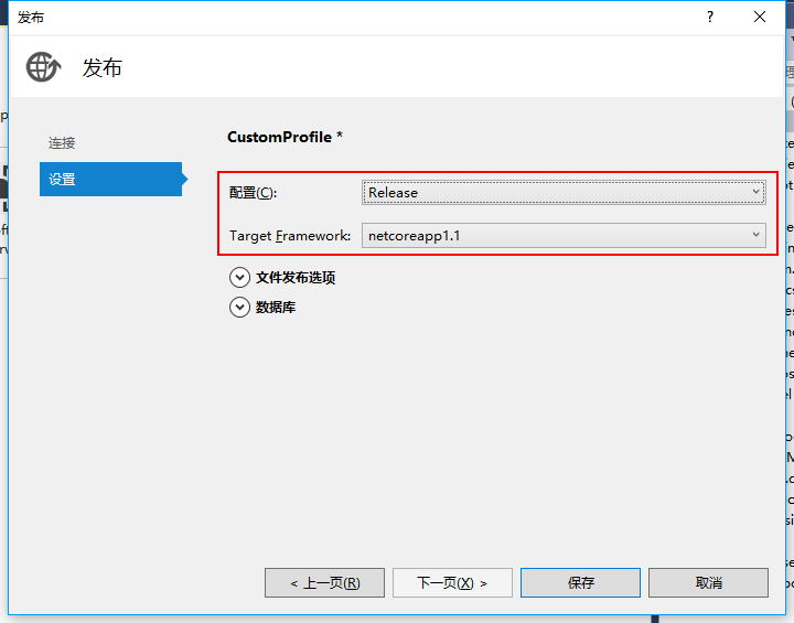 3、配置文件可以根據(jù)你線上、線下的環(huán)境進行選擇,因為是基于.NET Core,所以目標(biāo)框架為netcoreapp1.1,然后保存發(fā)布即可