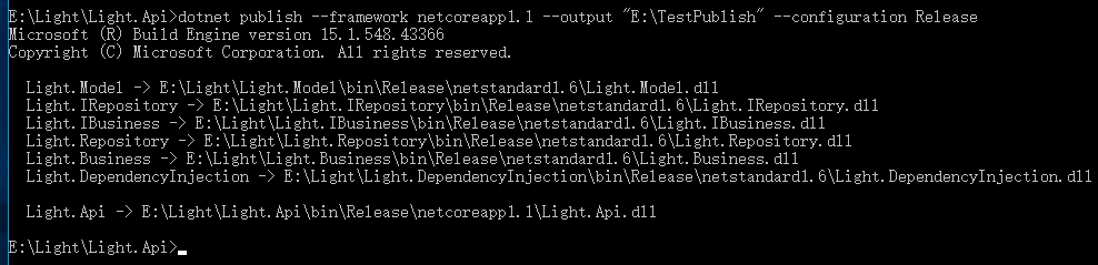 4、當(dāng)然了,你還可以基于CLI的Publish命令進行發(fā)布,只需切換到Light.API根目錄下,輸入以下命令即可