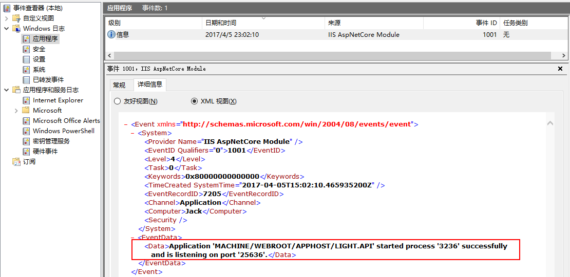 5、重新訪問網(wǎng)站,然后打開Windows應(yīng)用程序日志,你會看到這樣一條信息。意思是說你的應(yīng)用程序已經(jīng)由PID為3236的進程啟動,并且在25636的端口上監(jiān)聽著。