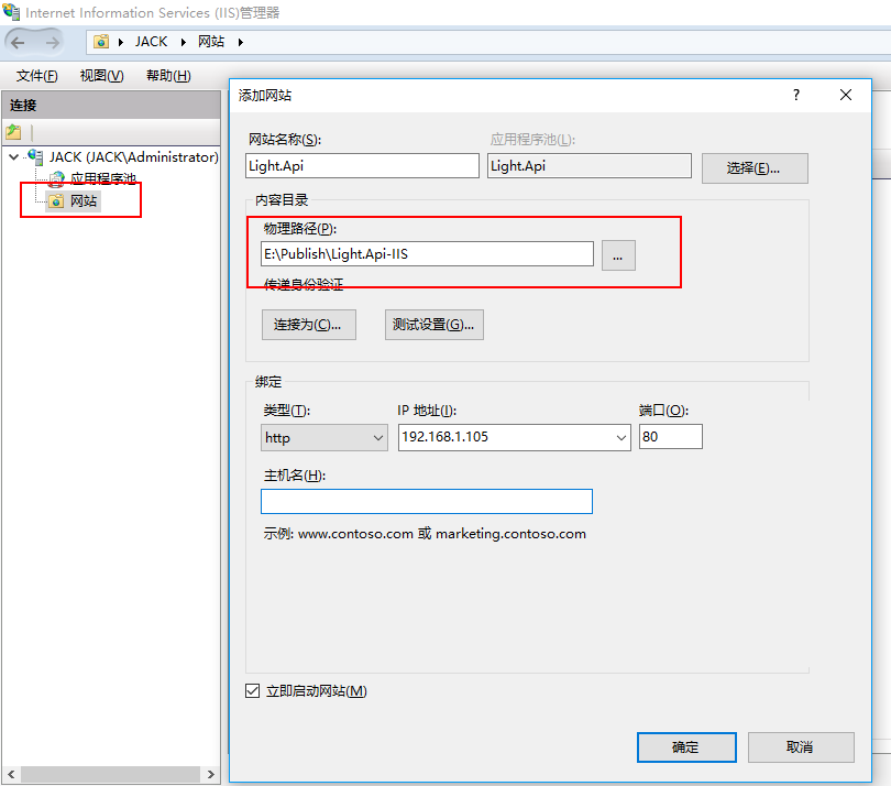 1、添加一個網(wǎng)站,設(shè)置一下名稱,并將路徑指向你剛才發(fā)布的文件夾,然后啟動網(wǎng)站即可