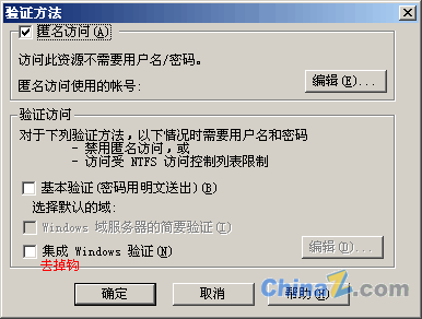 在IIS中打開web01站點屬性,選擇目錄安全性→匿名訪問和驗證控制→編輯,去掉"集成Windows驗證"前的鉤,再編輯匿名訪問使用的帳號,設置匿名訪問帳號為web01(web02站點也一樣設置)。