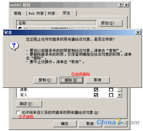 打開E:/web01文件夾屬性窗口,選擇安全選項卡,先去掉"允許將來自父系的可繼承權限傳播給該對象"前的鉤,經彈出的對話框中選擇刪除繼承權限。
