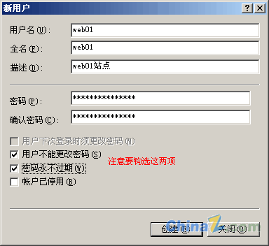 建立用戶web01,注意要鉤選"密碼永不過期"(否則背后會出現"HTTP 401.1 - 未授權:登錄失敗"),并設置其只隸屬于webs用戶組。同樣在建一個用戶web02。