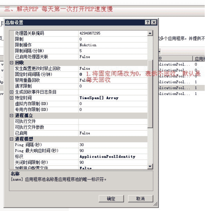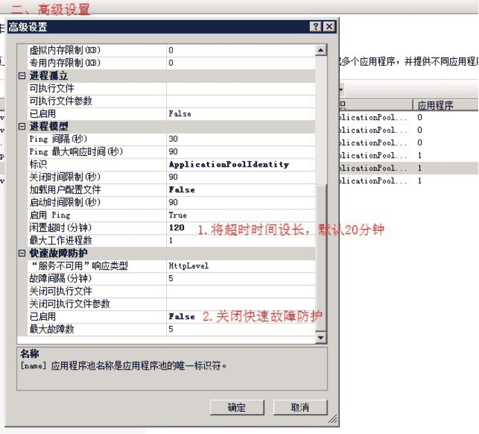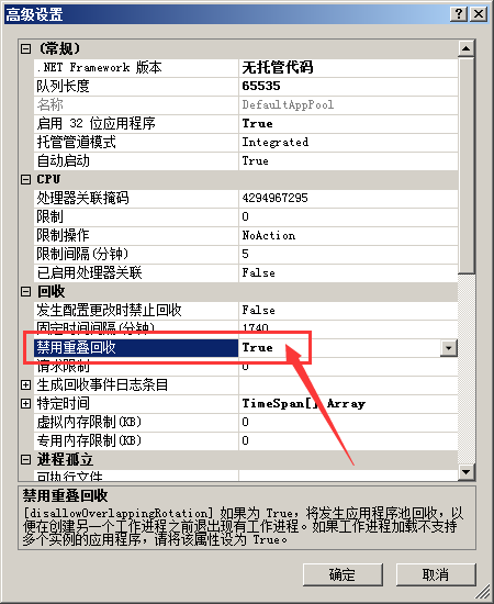 打開應用程序池 -> 高級設(shè)置 ->在“禁止重疊回收”里選擇“true”,這樣就有效避免了應用程序池回收假死問題。