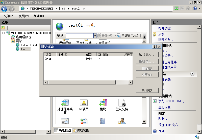 3、保存后返回,選擇右側邊綁定,然后選擇編輯 ,修改網站端口,80(默認)或其他端口,建議使用默認80端口。也可以設置默認站點IP地址。