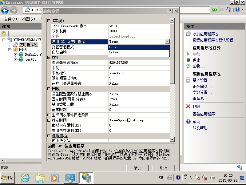 5、返回,點擊左邊應用程序池節點,查看剛才使用的應用程序池的高級屬性(這里是DafaultAppPool)。